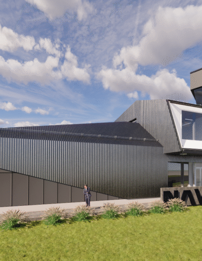 This new architectural prototype presents a streamlined vision for the future of aviation technology and infrastructure—consolidating complex systems into a singular, purpose-built facility. The design boldly references the angular geometry of stealth aircraft, translating aeronautical performance into architectural form.