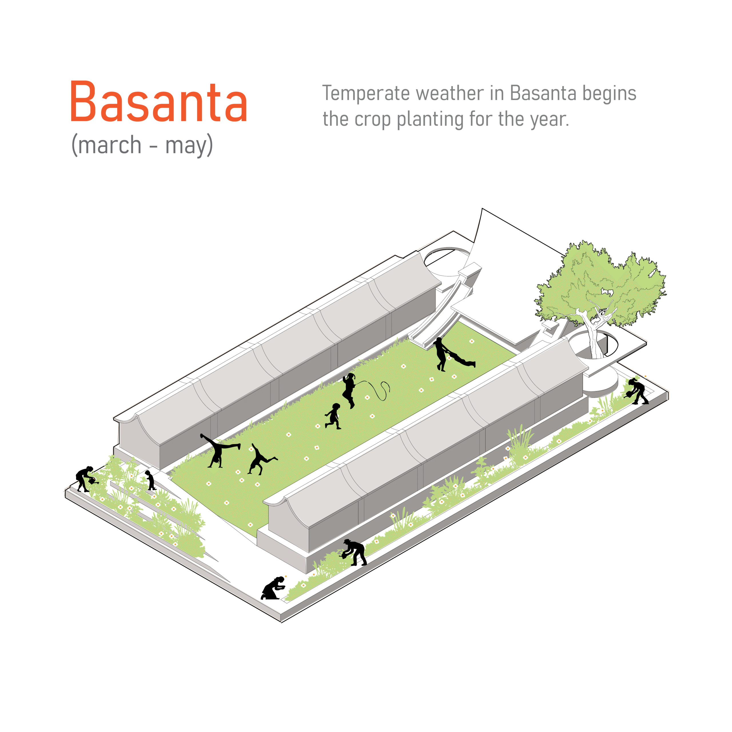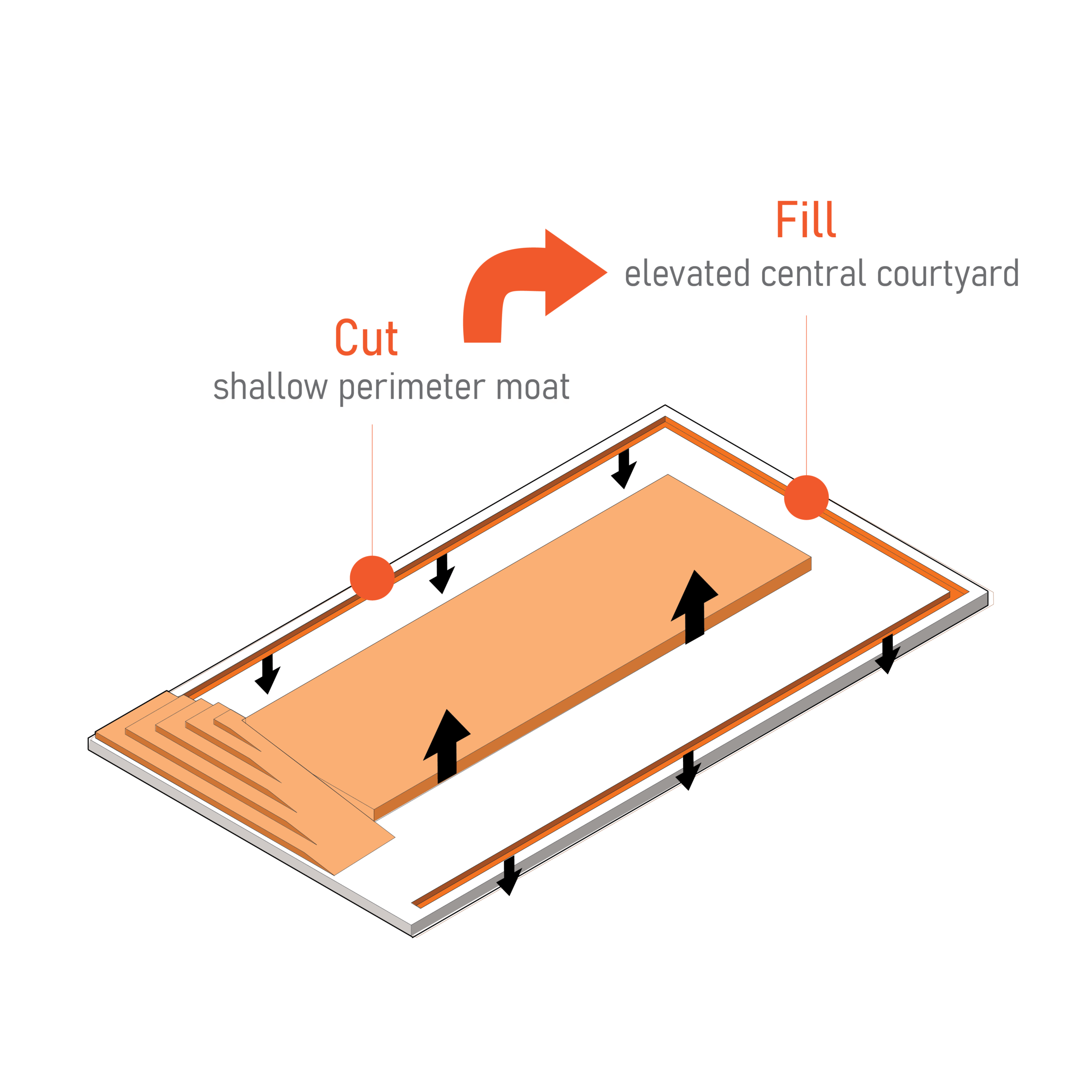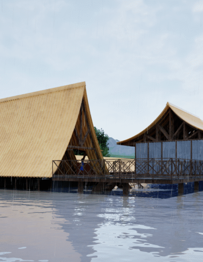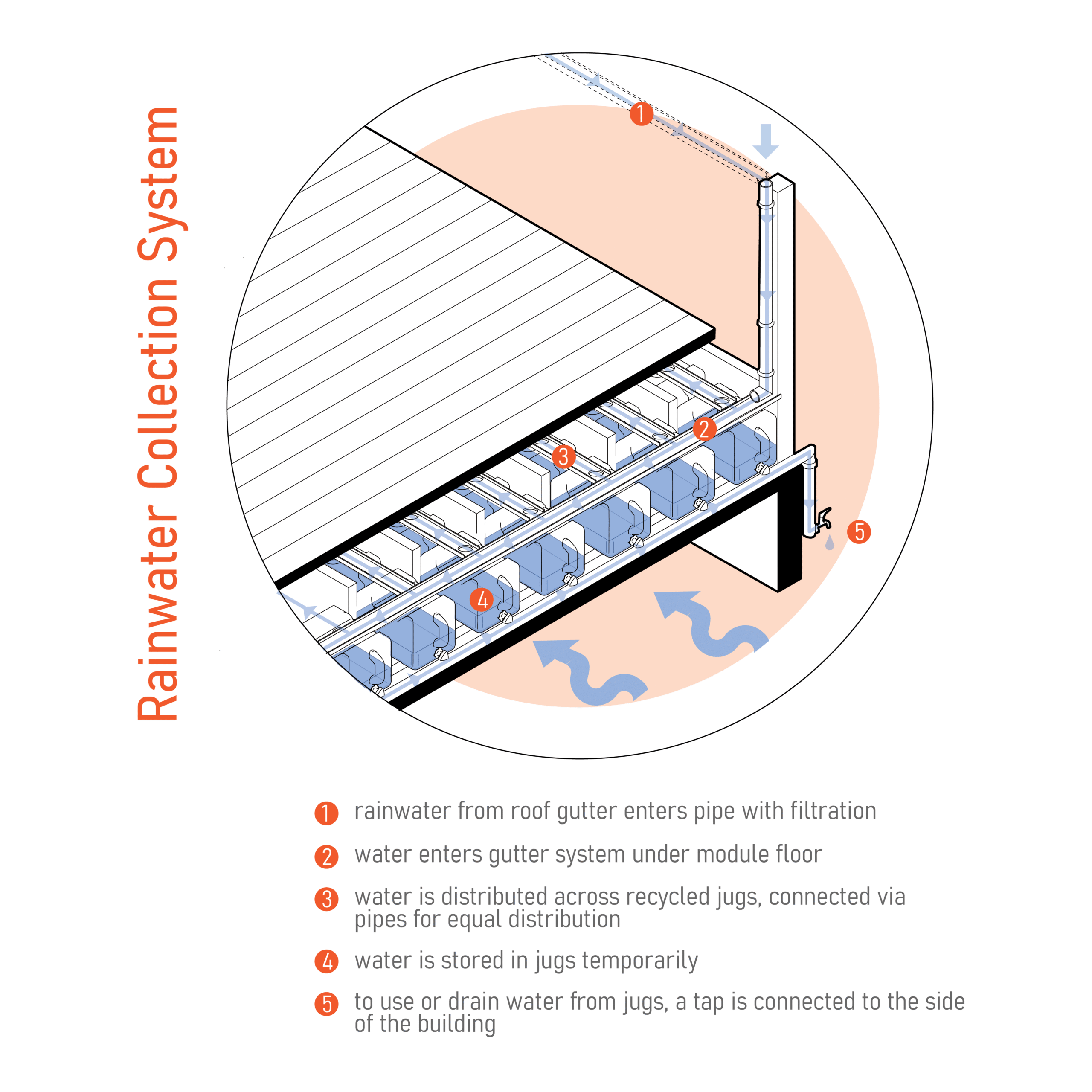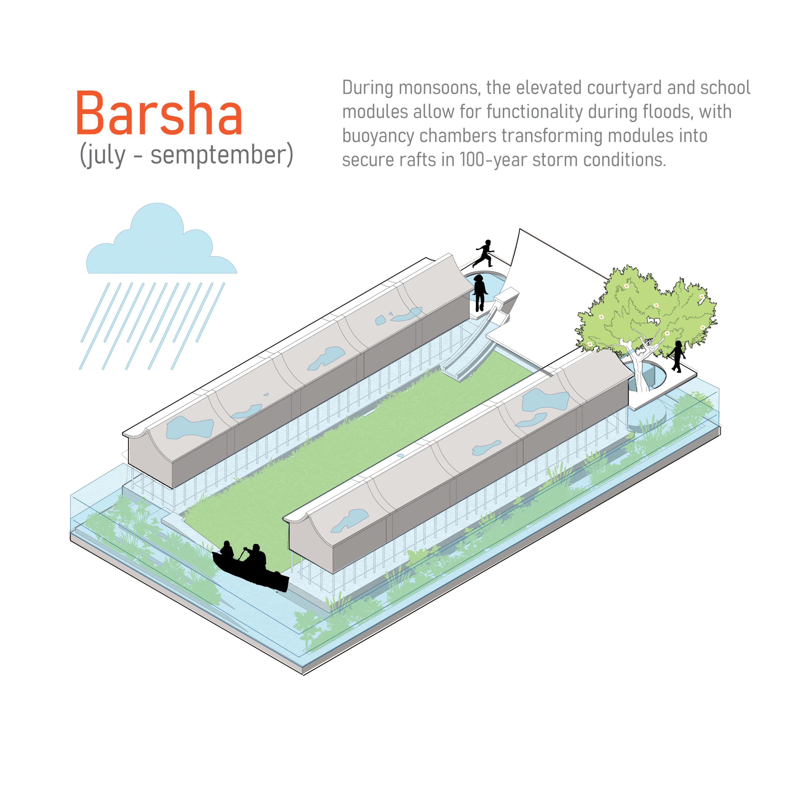 RISE applies a Moat > Boat > Float strategy to respond to seasonal and extreme weather events. A shallow perimeter moat collects monsoon rain and becomes a productive garden in dryer seasons. Classrooms sit elevated, with embedded water jugs between floor joists. These jugs store water during dry months and provide buoyancy that elevates classrooms during floods. When waters rise, classrooms lift and anchor to a central multipurpose loft above flood levels.
