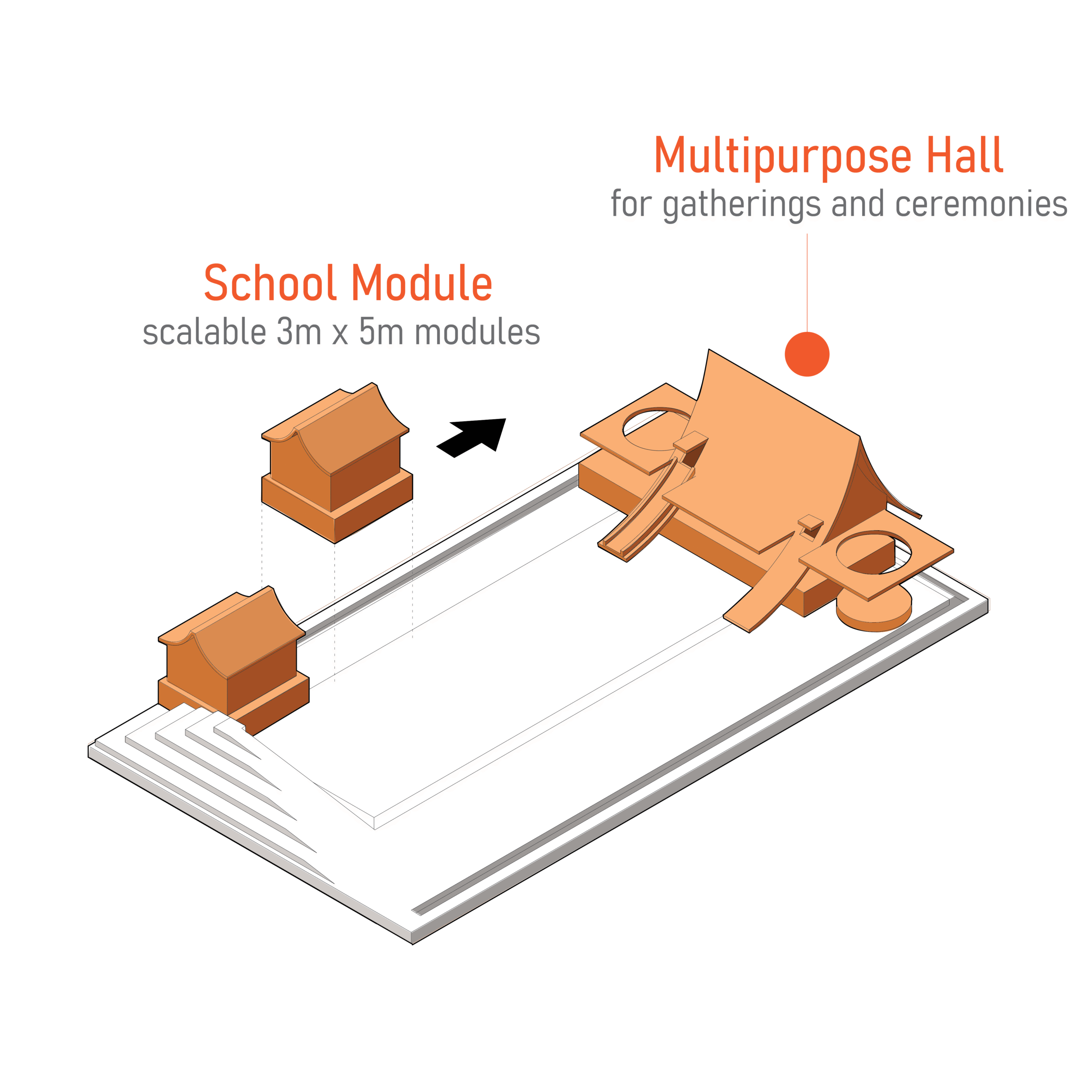 Each 3×5m classroom module is easily replicable, enabling phased construction as funding becomes available. Future additions—canteens, offices, dorms—can expand the site into a full courtyard layout, adaptable to changing needs and site conditions.
