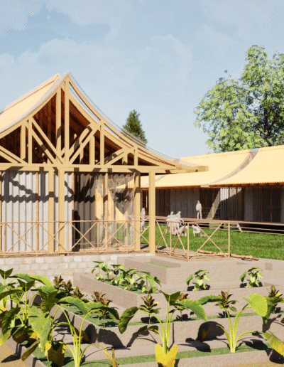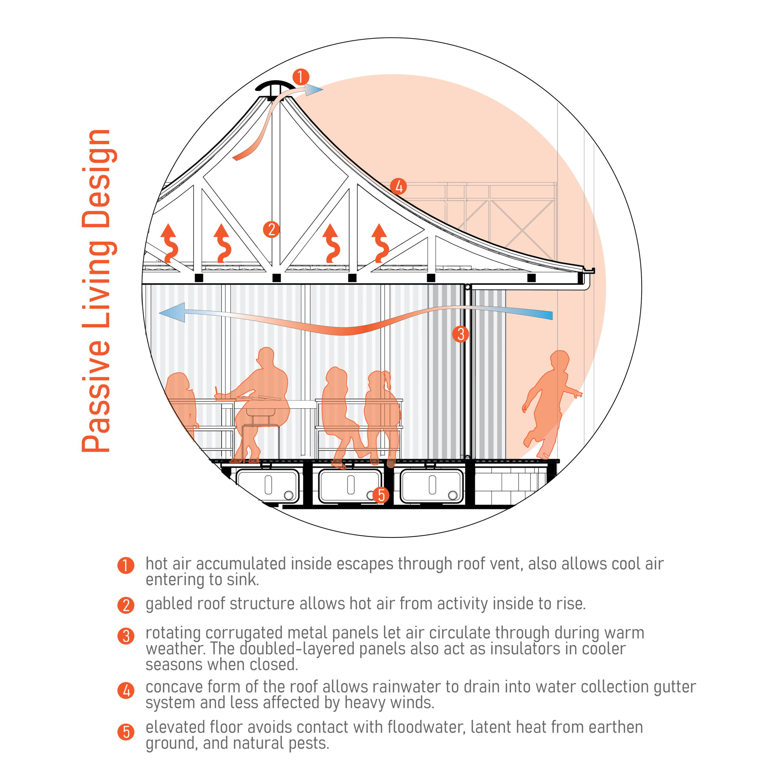 Constructed from widely available materials—bamboo, timber, rebar, concrete blocks, corrugated metal, and recycled plastic—RISE is affordable and easy to build. Passive strategies include pagoda-style and peaked roofs that manage wind and water while promoting cross-ventilation and daylight. Rainwater harvesting and composting toilets integrated into the moat system support long-term environmental sustainability.