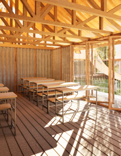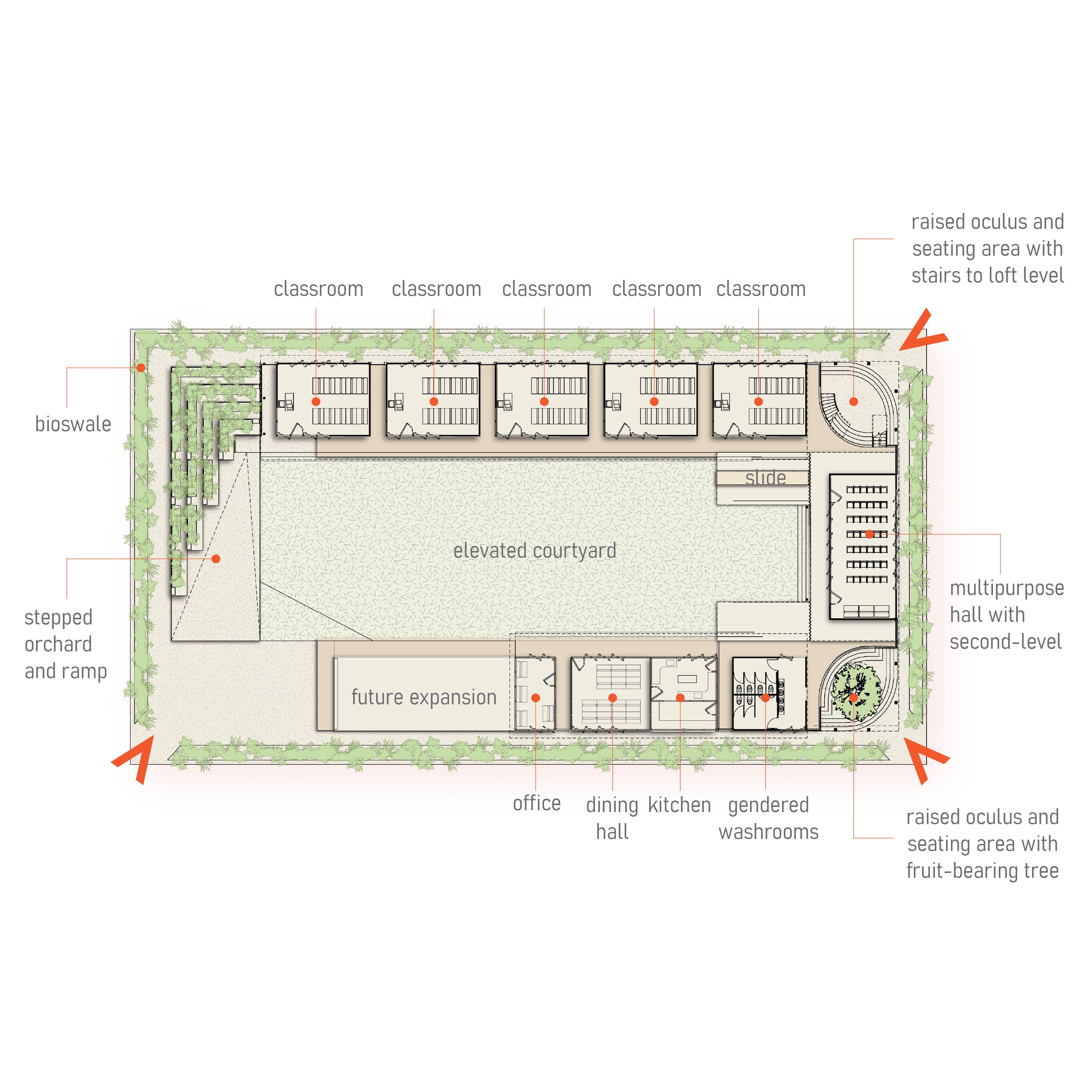 RISE invites collaboration. Its phased, low-tech construction can be executed by local builders. The simple strategy also acts as a beacon for the area to enable community gatherings, markets & sports to be played on the field when school is out. The bright color of the roof acts as a beacon for the community to gather to both celebrate and support each other.