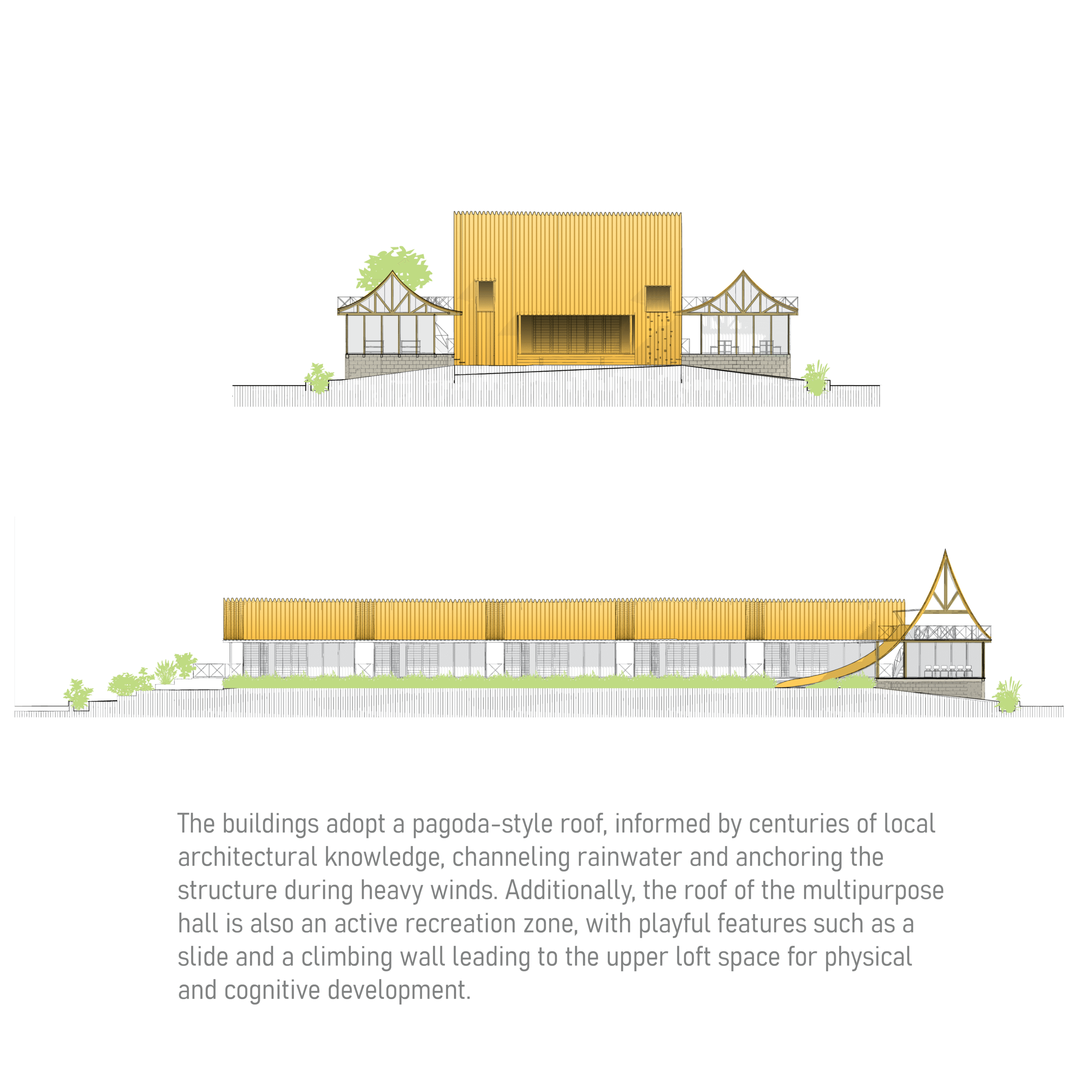 RISE reflects the vernacular architecture and local craftsmanship. The multipurpose hall doubles as a library and gathering space, while its rooftop transforms into a playground. Slides and climbing walls turn the architecture into playful, confidence-building tools. Entry corners feature amphitheatre-style steps that serve as welcoming spaces and outdoor classrooms, anchoring the school in community life.
