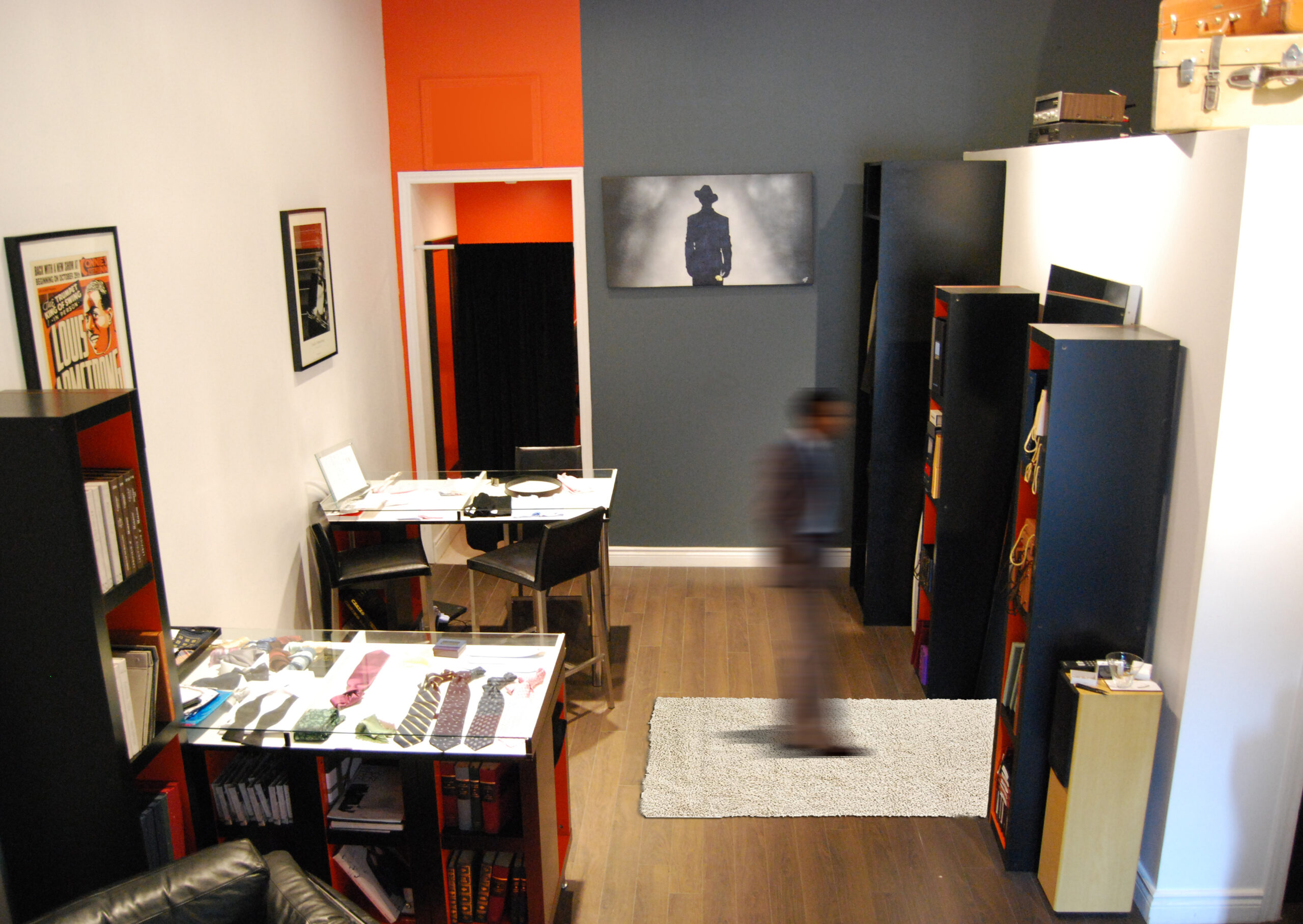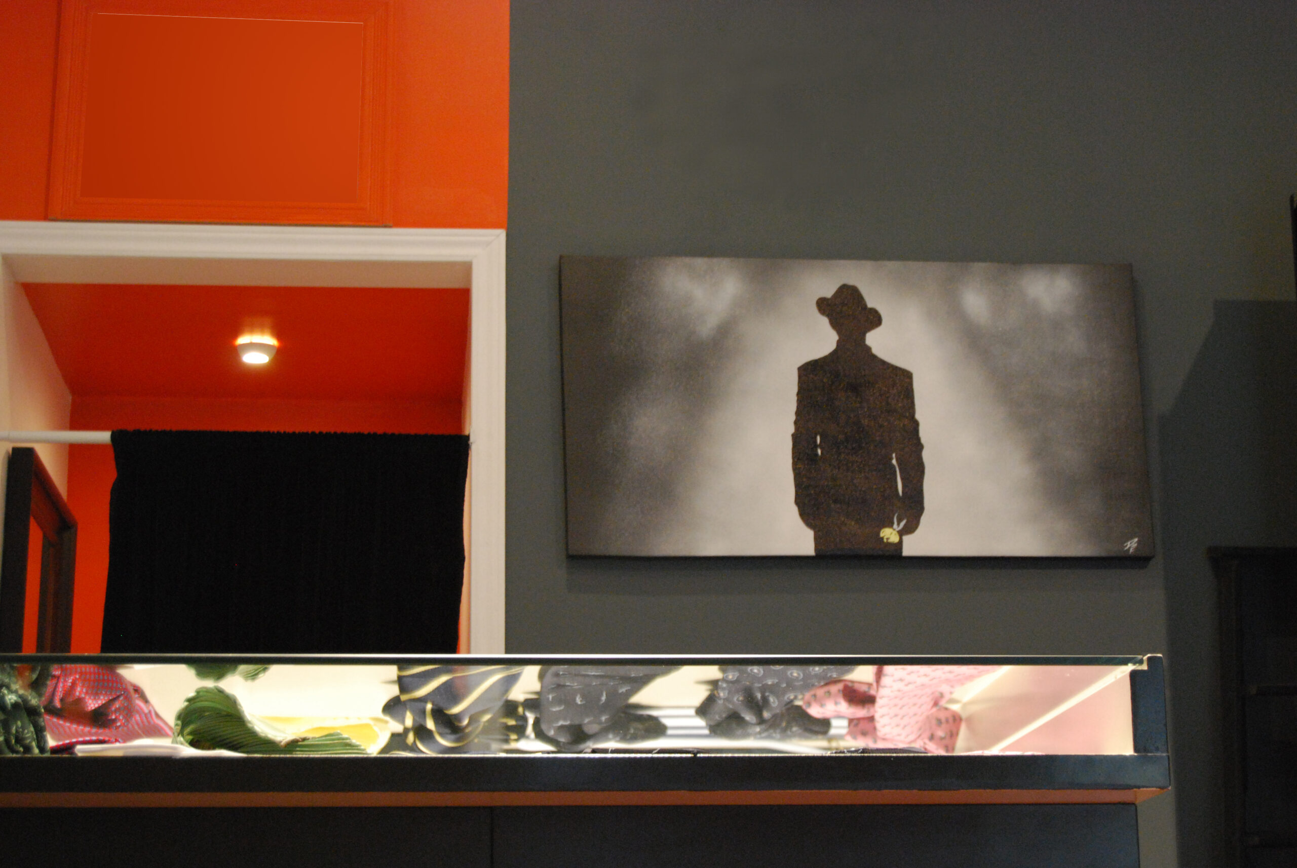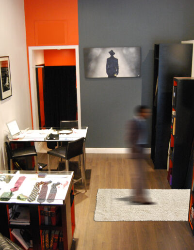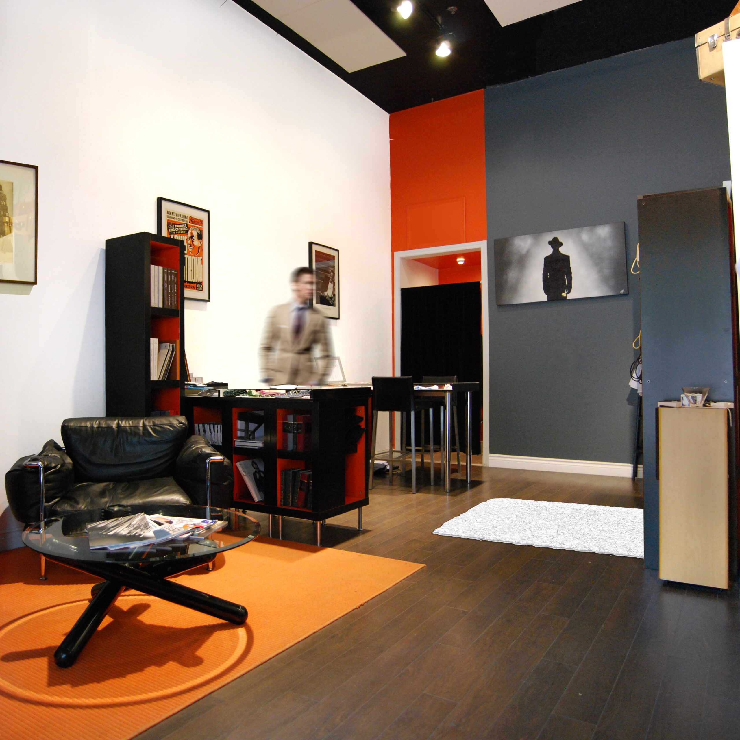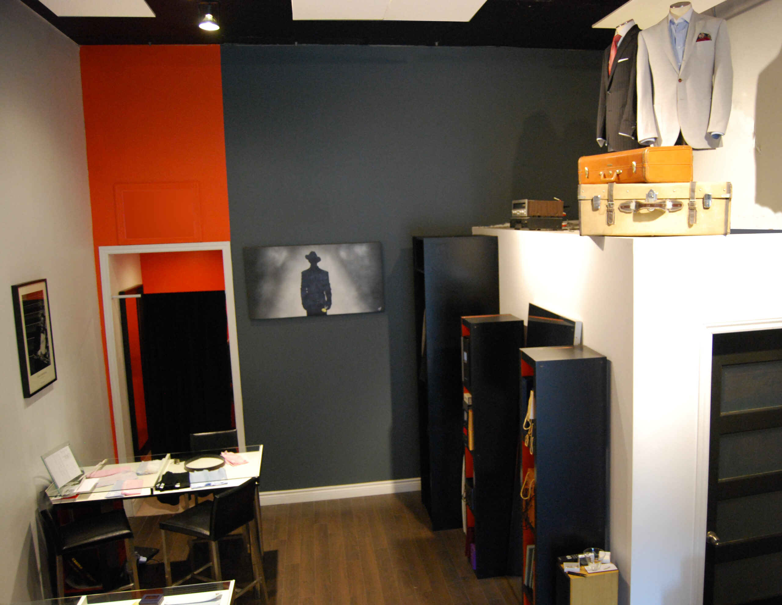 Using their signature colors, the furniture and showroom were painted to reinforce the brand. The juxtaposition of the ‘serious’ black exterior and ‘fun’ orange mimics the professional vs. ‘fun’ fabric combinations of bespoke suits. To revitalize the boring dropped ceiling, a textured depth was created using 24”x48” artist canvas. The new treatment gave the ceiling a new dynamic appearance and helped reflect more light into the showroom space.