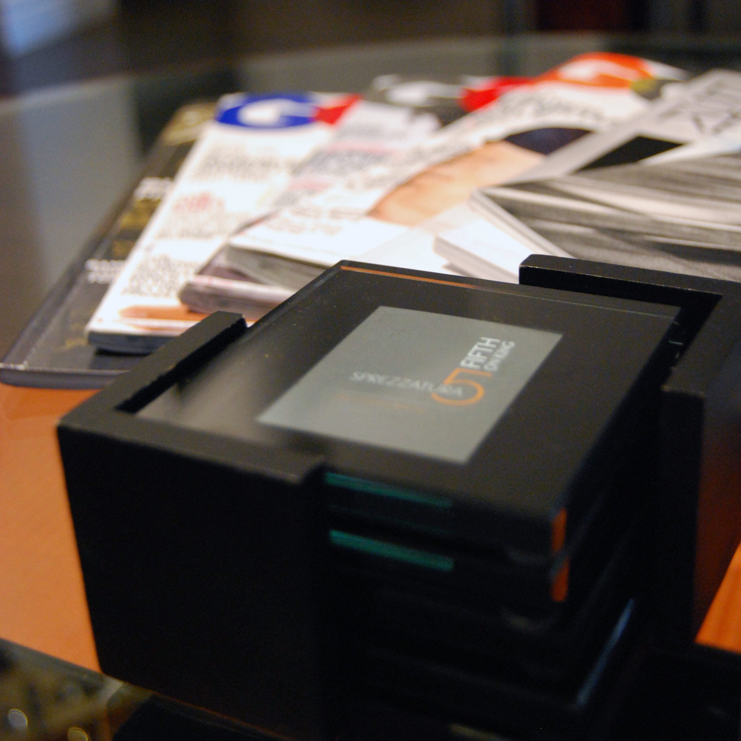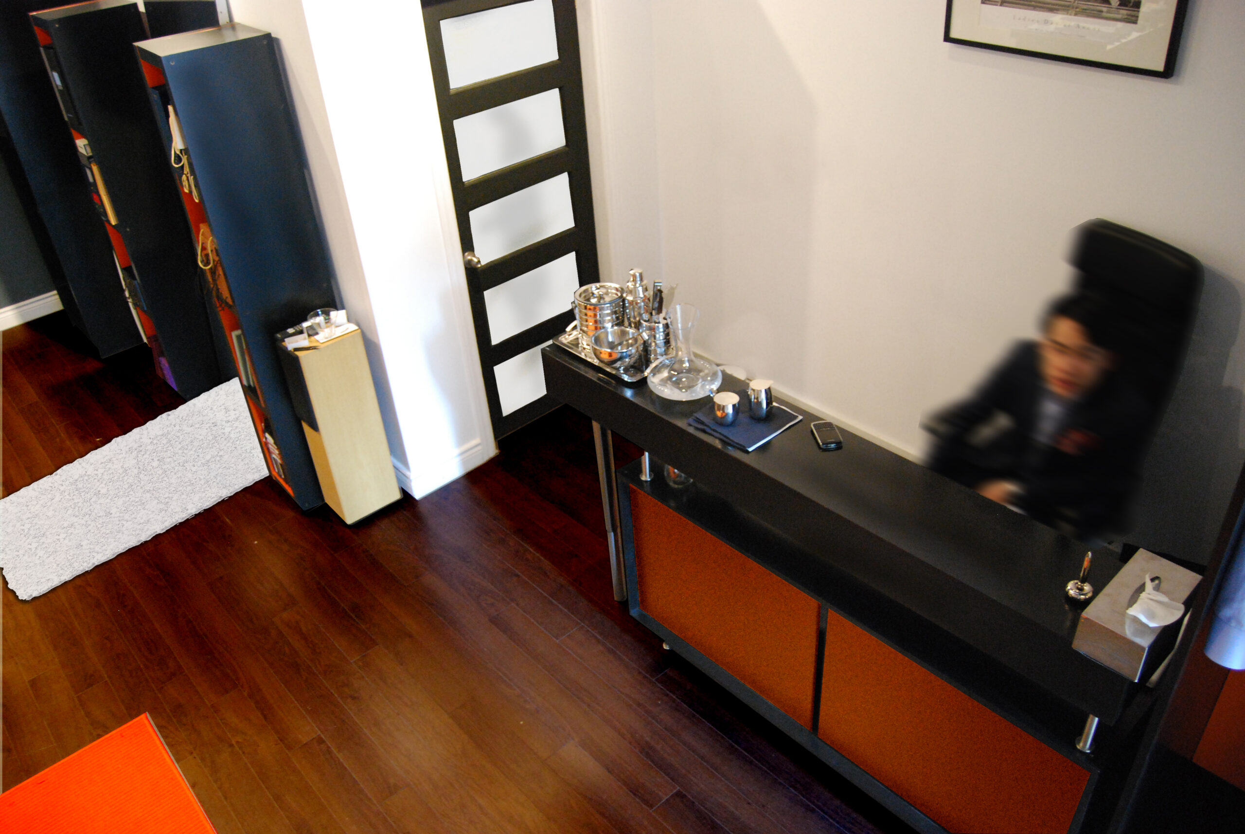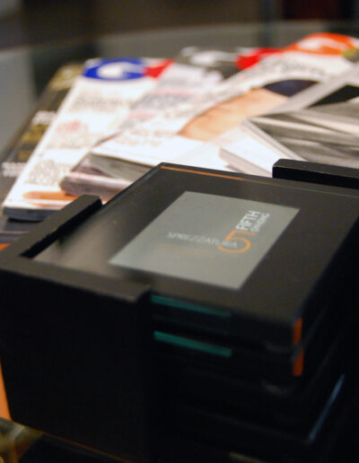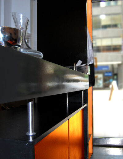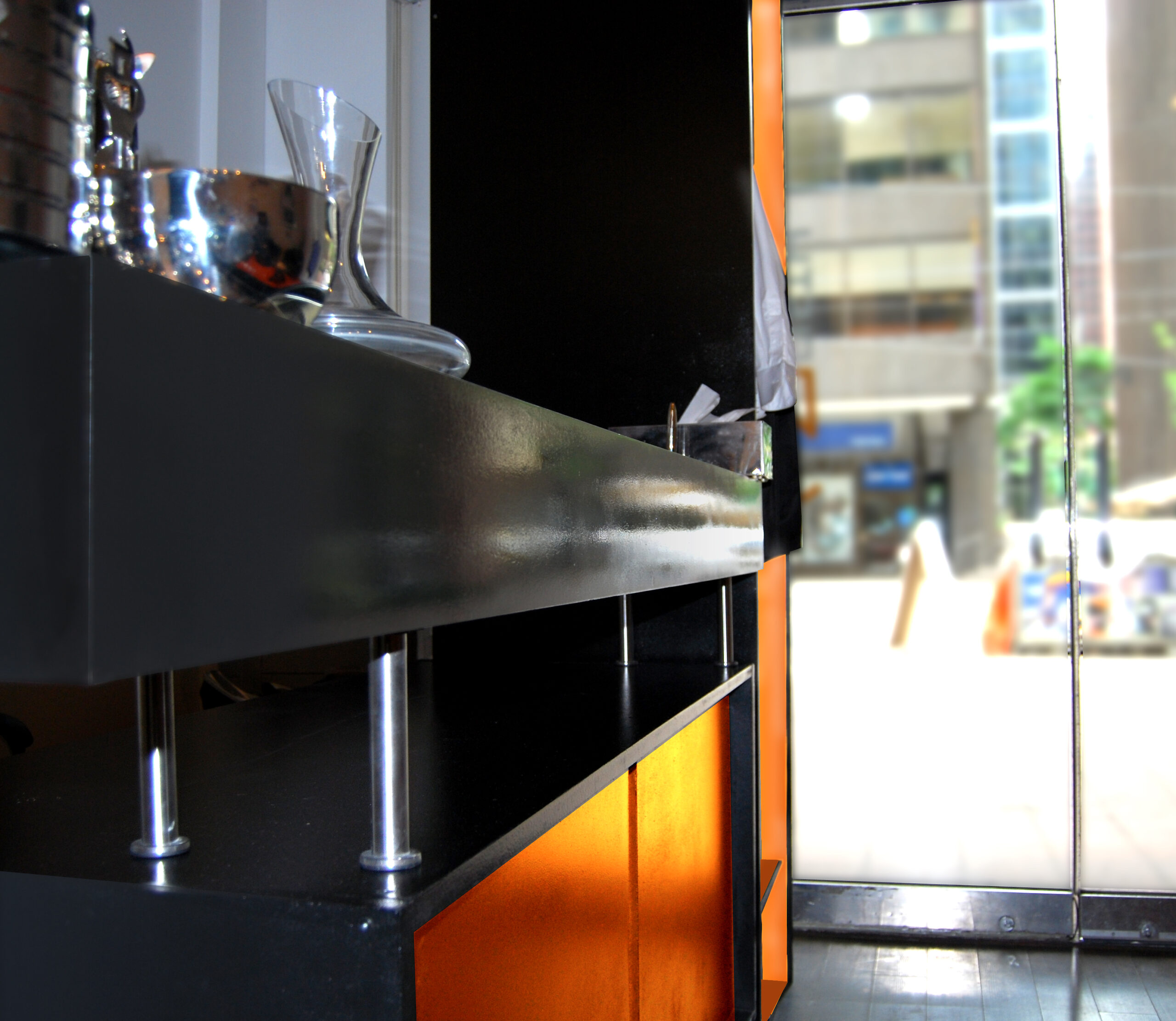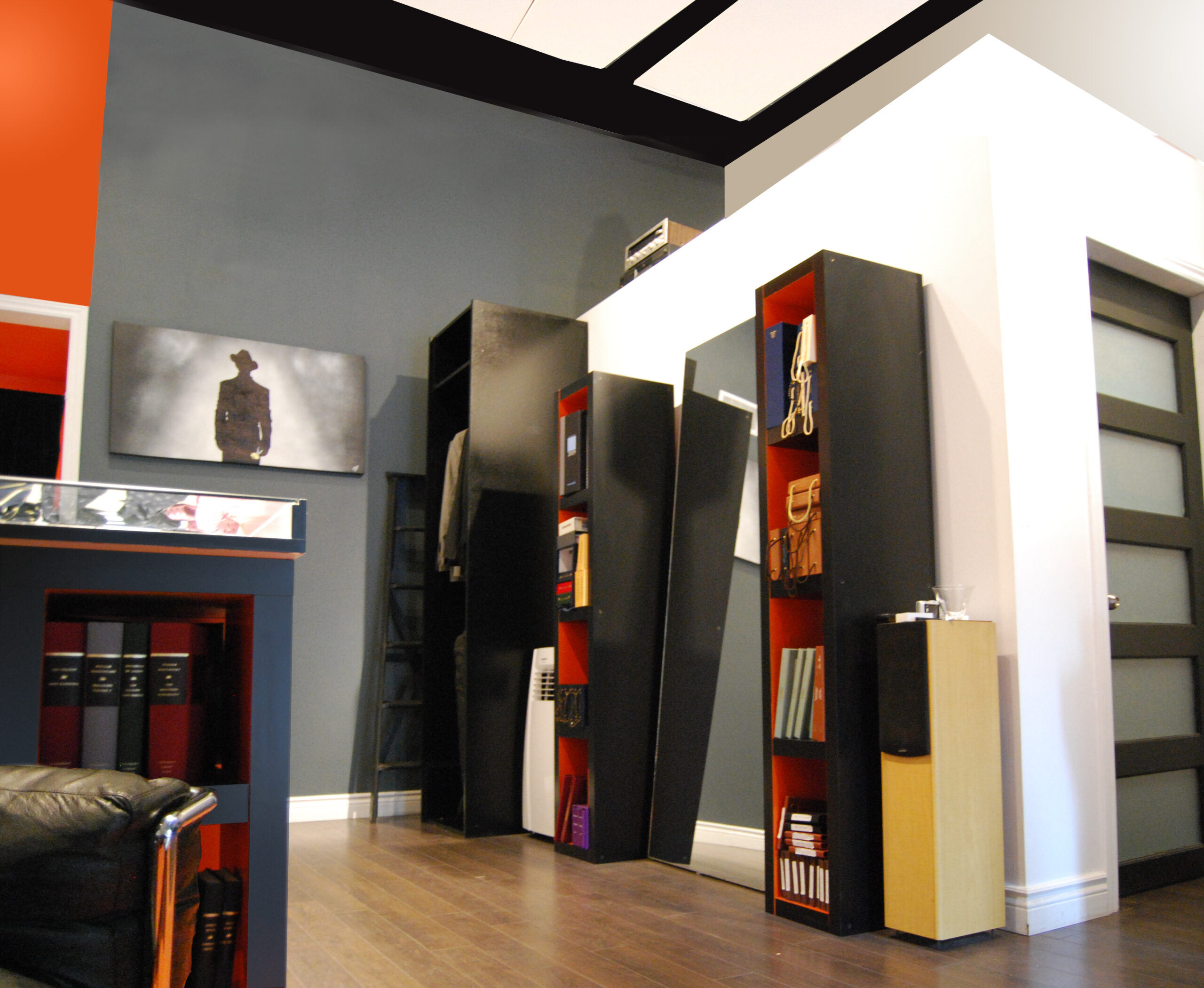 Using their signature colors, the furniture and showroom were painted to reinforce the brand. The juxtaposition of the ‘serious’ black exterior and ‘fun’ orange mimics the professional vs. ‘fun’ fabric combinations of bespoke suits. To revitalize the boring dropped ceiling, a textured depth was created using 24”x48” artist canvas. The new treatment gave the ceiling a new dynamic appearance and helped reflect more light into the showroom space.